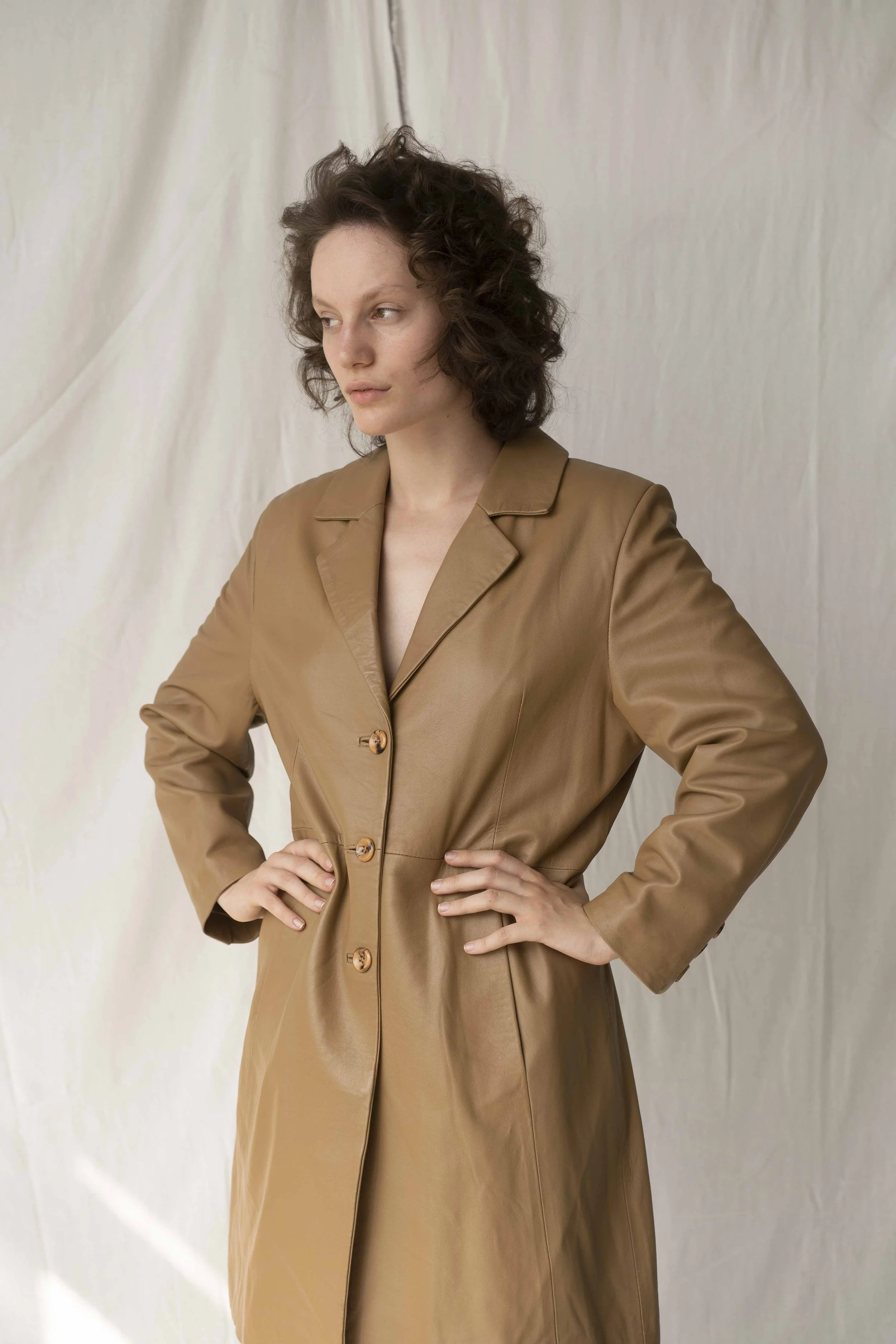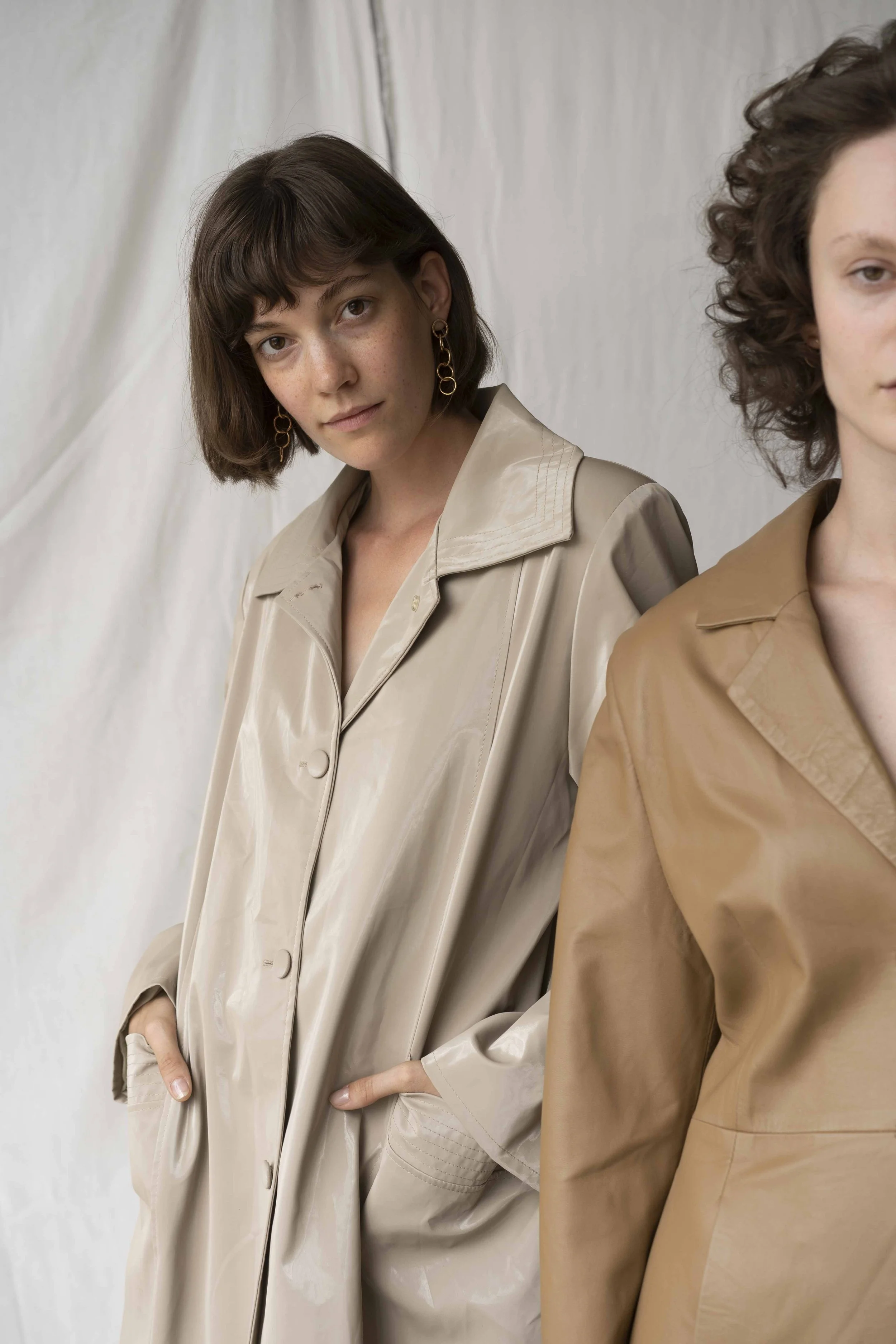 The vintage curation pillar focuses on carefully selected pre-owned clothing, emphasizing minimalist style, neutral palettes, and high-quality fabrics such as wool, angora, cashmere, cotton, linen, rami, viscose, and silk. Seasonal pieces often feature details like pearl buttons to complement a timeless wardrobe.
