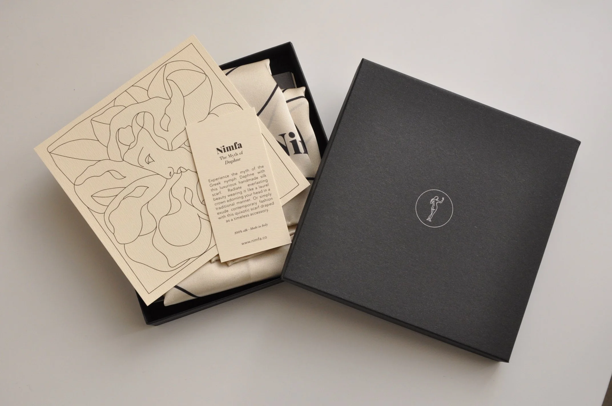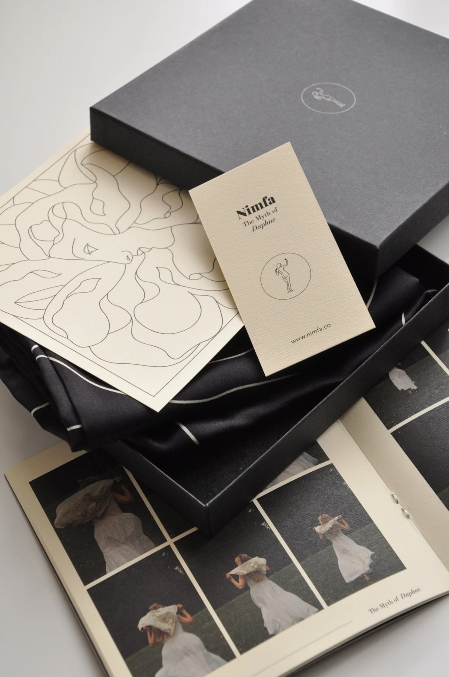 I also dreamt of the main pieces; silk scarves telling storries of the past for a moder audiance. I wanted to create lasting, weaarble pieces, that celebrated art&literature, where I could express antient stories in a modern way. Packaged and delivered with a rewritten story from greek mythology in a modern language, while wearing an illustration, reflecting to it. My purpose was to bring art and fashion closer to each other, while practicing ethical branding, production, high quality, storytelling, graphic design and illustration, while trying to make it as affordable as possible.
